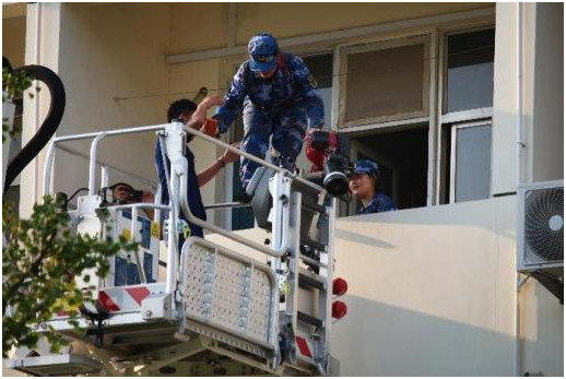 公开课后,在东昌府区消防救援大队参演官兵的指导下,400余名新生参与了应急疏散逃生演练和灭火实操技能训练。应急疏散逃生演练中,学苑4号宿舍楼被困的两名同学由消防队员使用高空救援云梯进行了助力逃生疏散,其他学生也进行了有序撤离。疏散逃生演练结束后,消防管理中心工作人员为新生进行了消防知识的培训和灭火器的实操演练。